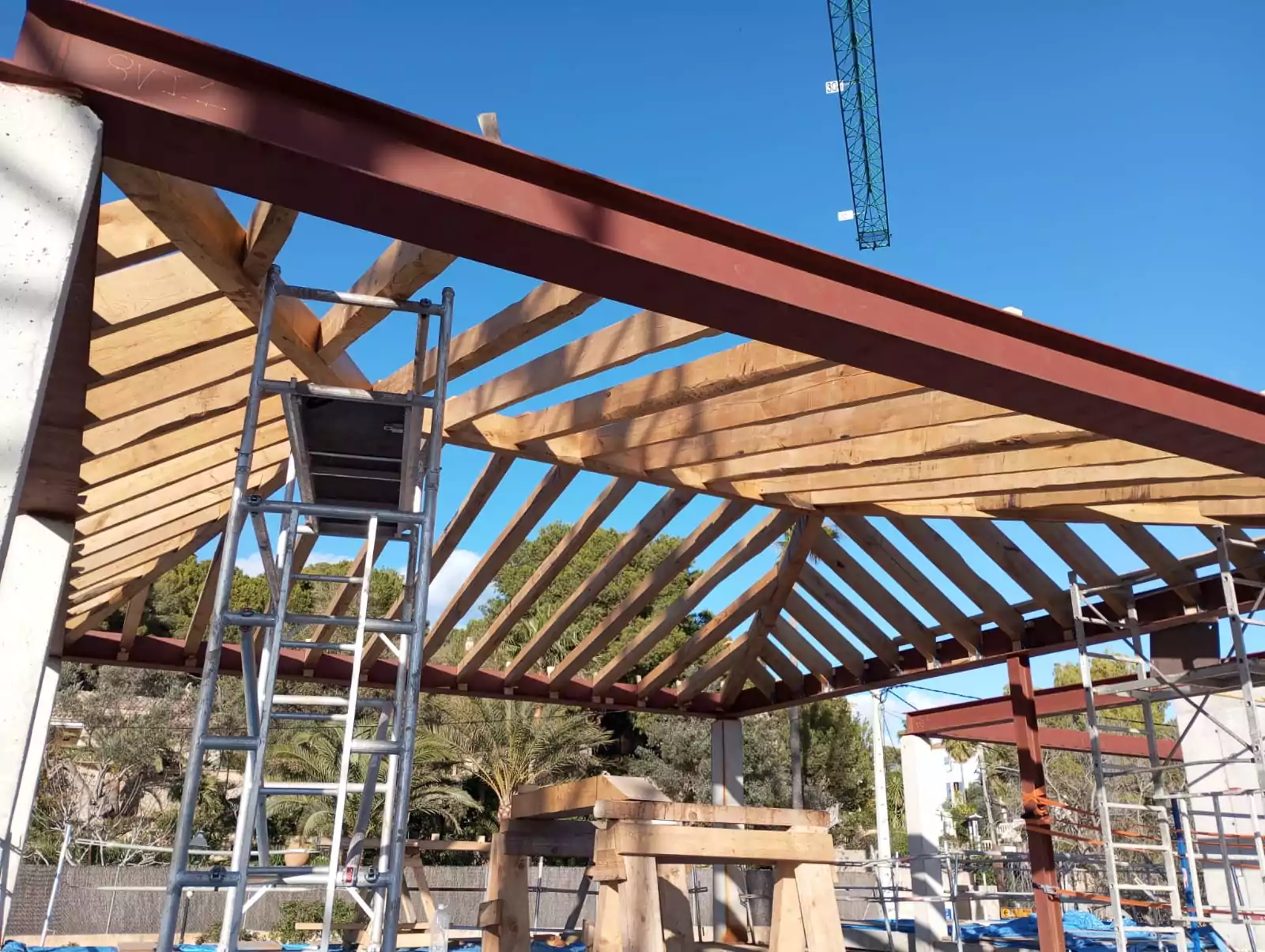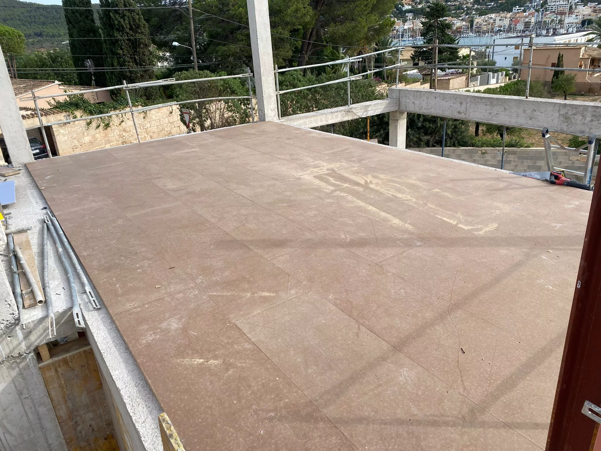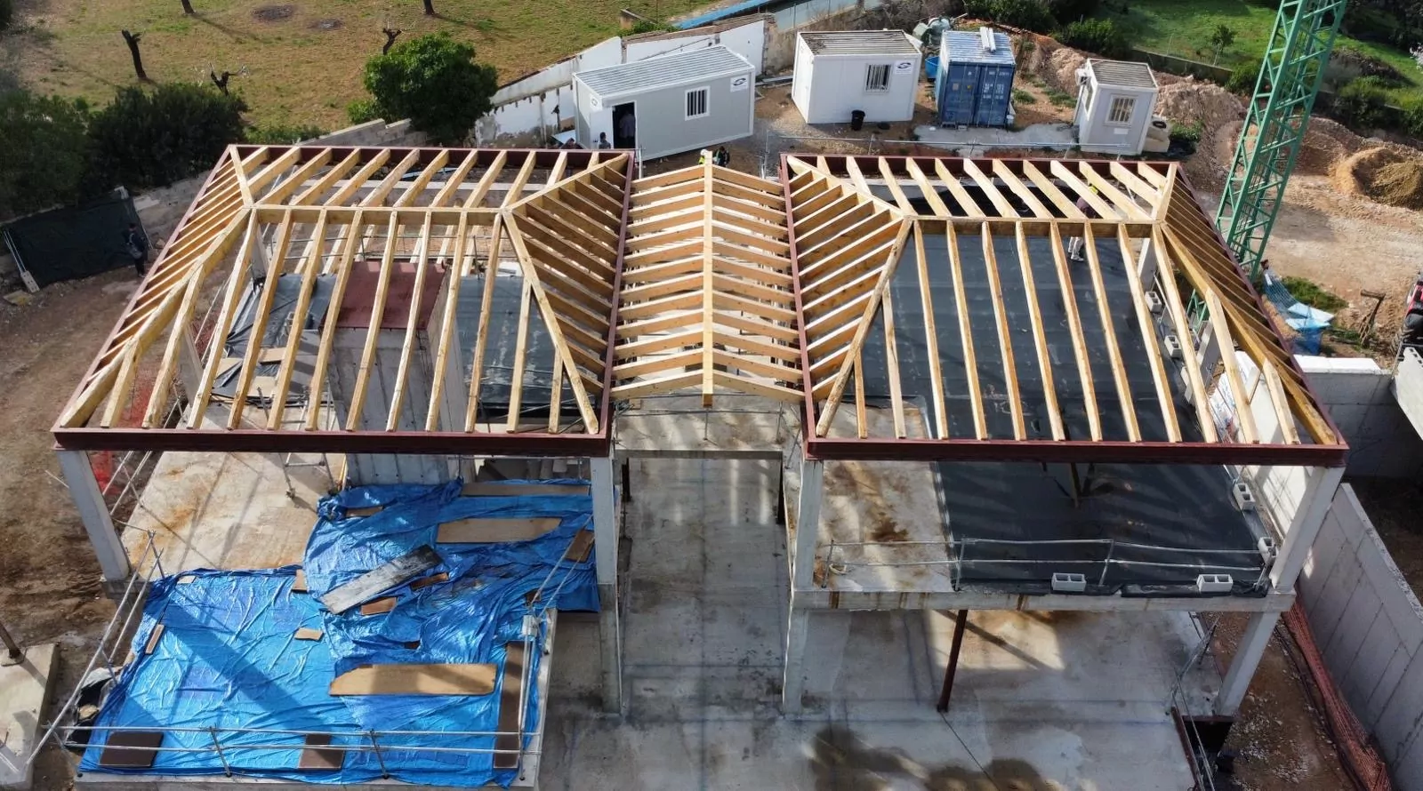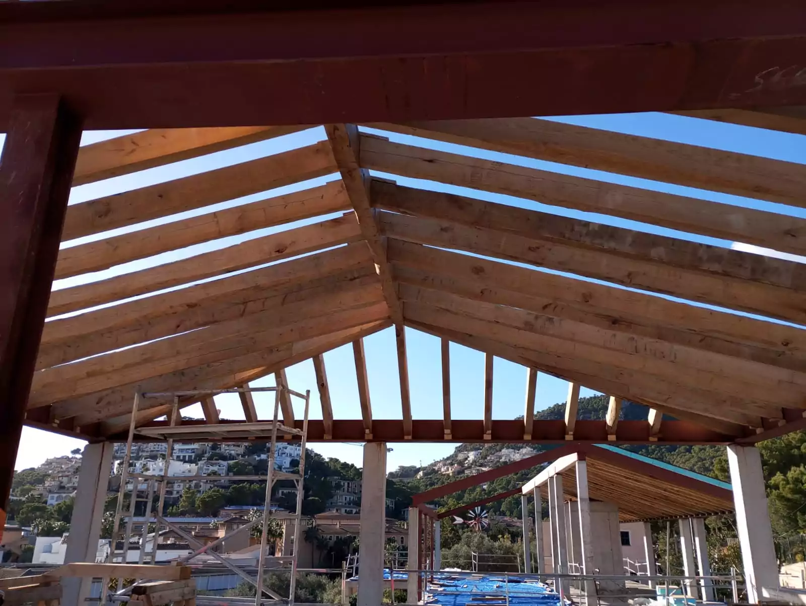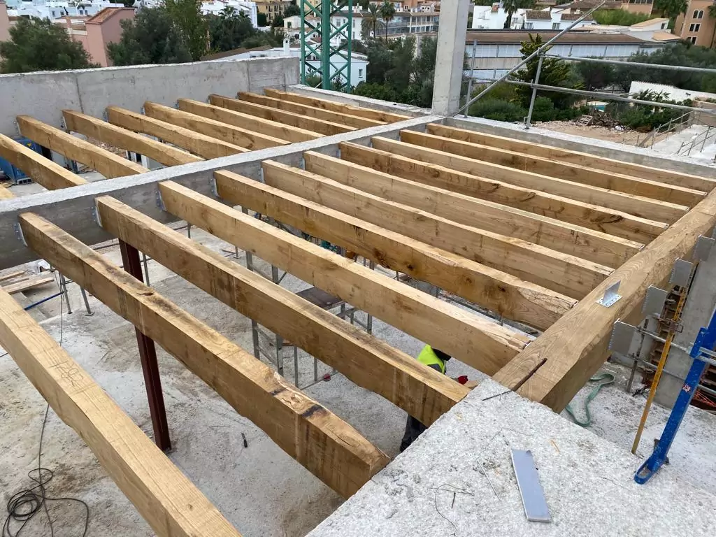 Este proyecto de construcción en Mallorca se centra en la realización de cubiertas y forjados para una vivienda, integrando materiales de alta calidad y técnicas innovadoras. El forjado plano de la planta baja utiliza vigas de castaño macizo, un material natural que aporta resistencia, estética y durabilidad. Sobre estas vigas, se han instalado tableros Superpan Tech de Finsa, reconocidos por su alto rendimiento y sostenibilidad. Para la cubierta, se ha optado por panel sándwich, una solución moderna que garantiza un excelente aislamiento térmico, eficiencia energética y una instalación rápida. Este proyecto combina tradición y modernidad, destacando en el sector de la construcción sostenible en Mallorca.